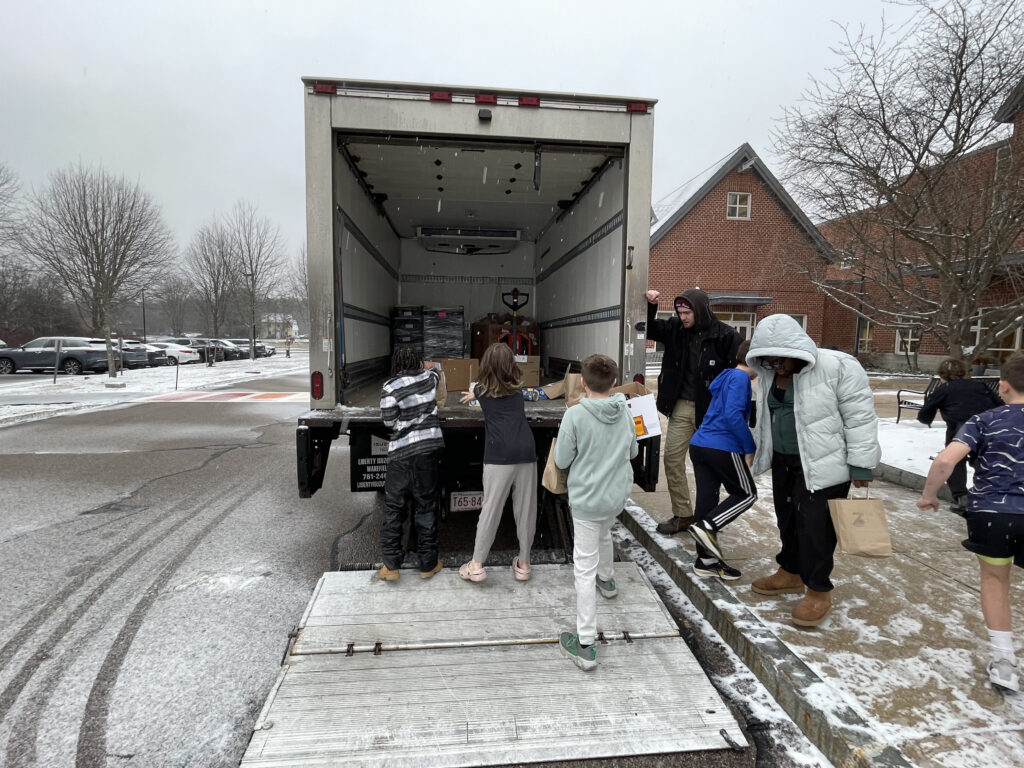 Amid a wintry mix, Alcott Elementary School students help load the Open Table collection truck with everything they gathered. (Photo Courtesy Concord Public Schools)