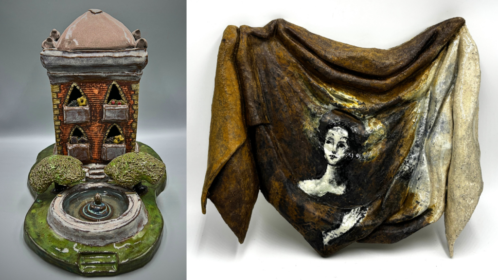 Chapman said Tibbitt’s work stands out for its imagination and detail, with architectural elements that invite viewers to study the piece closely. Rivero’s sculpture, she said, has a strong emotional quality, with folds of clay that feel alive and expressive.